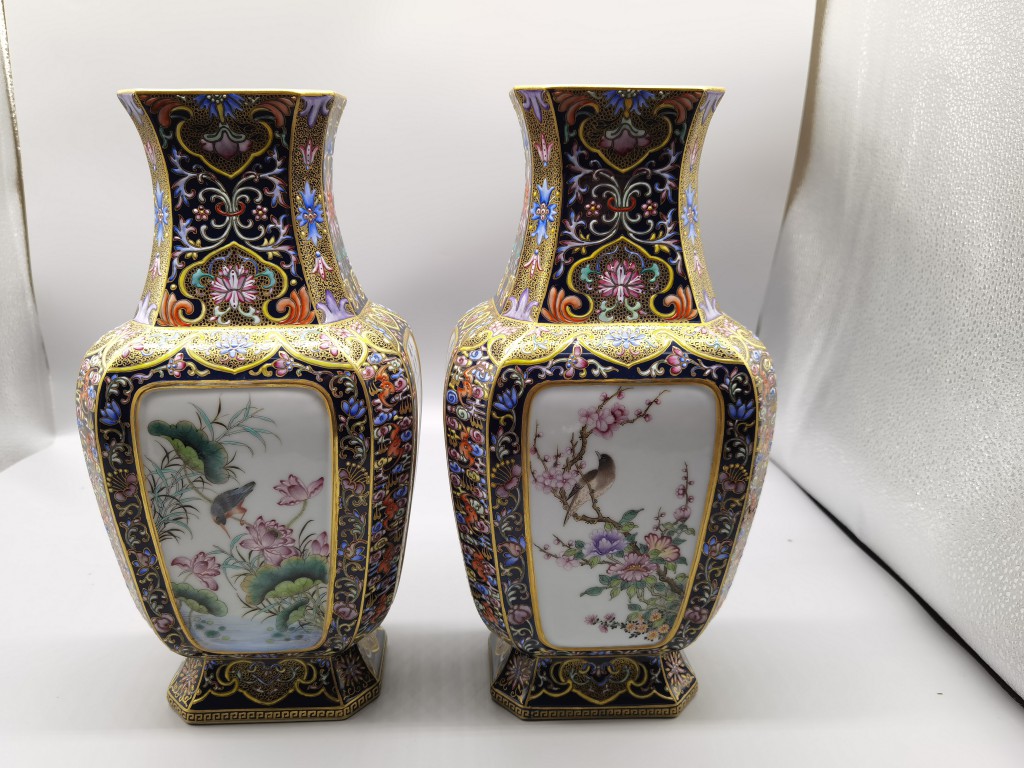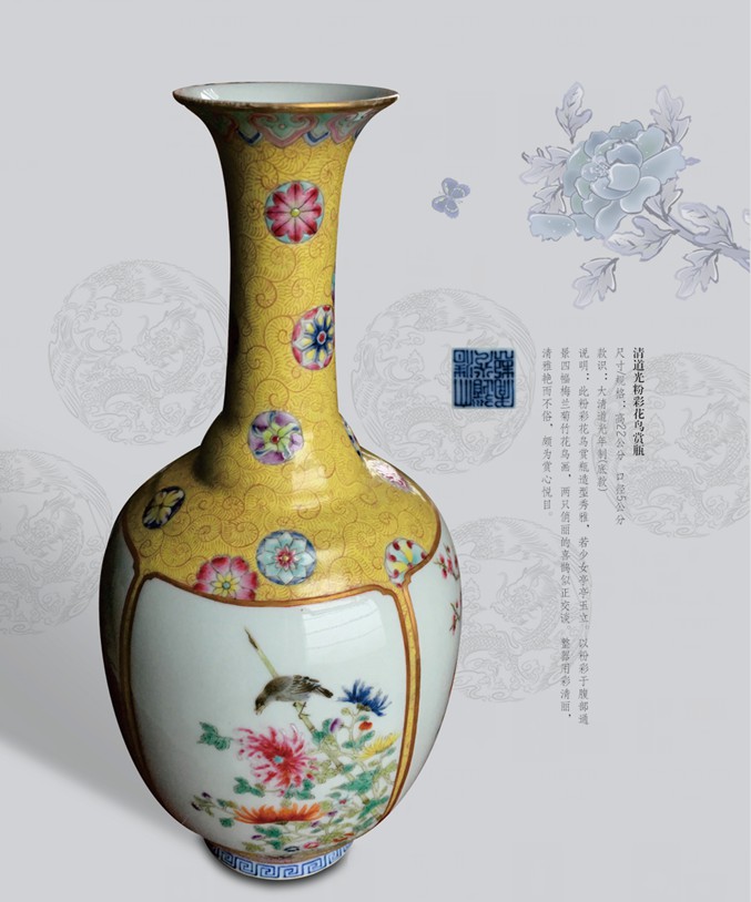 • (清乾隆) 磁胎洋彩青地金花魚遊轉(zhuǎn)心瓶(清乾隆) 磁胎洋彩青地金花魚遊轉(zhuǎn)心瓶